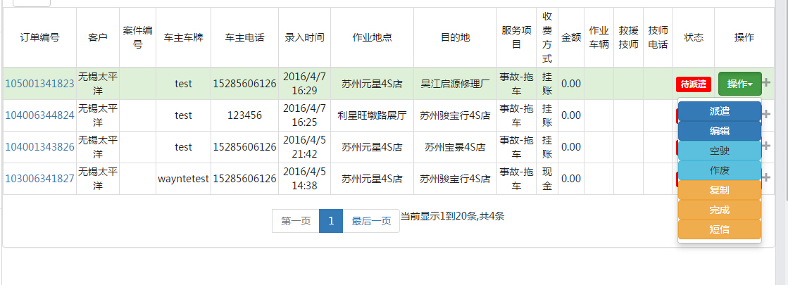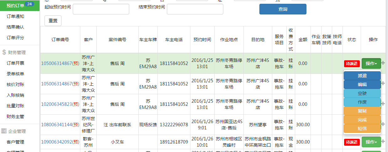 | 其中根据不同订单会有相应的操作,操作功能如下:"派遣","编辑","空驶","作废","复制","完成","短信" |