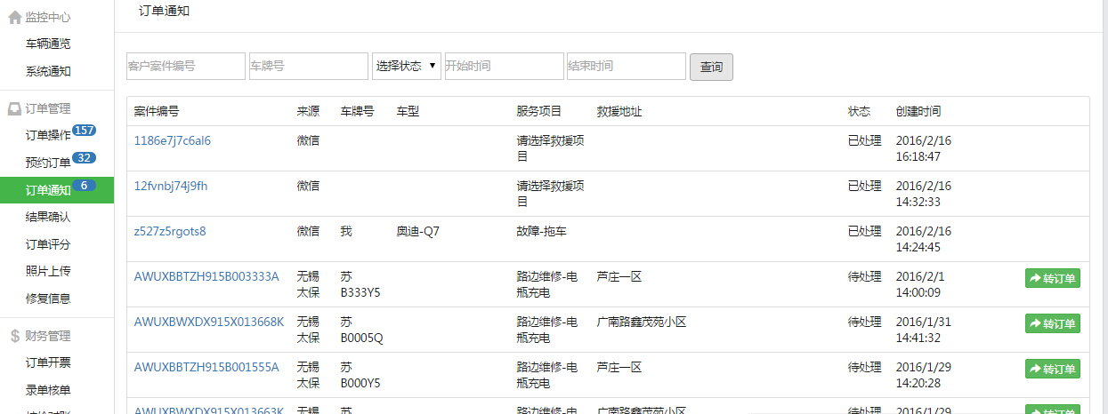 | 点击【订单管理】模块下的【订单通知】菜单可以将订单转换为平台订单,转换后的订单将直接显示,需调度员和被救援人员联系确认后进行救援车辆派遣 |