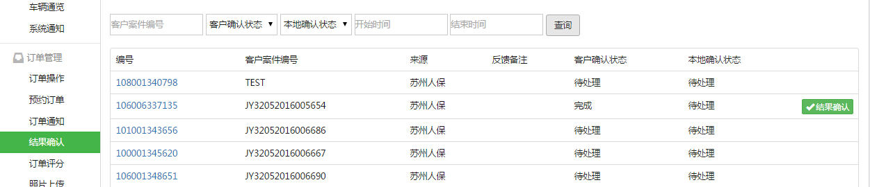 | 点击【订单管理】模块下的【结果确认】可以看到所有需要第三方确认的订单 |