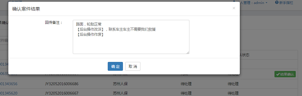 1)通过点击订单编号可以查看到该订单的详细信息,包括客户名称,委托人,联系电话,服务项目等 2)通过点击结果确认来编辑回传备注 |