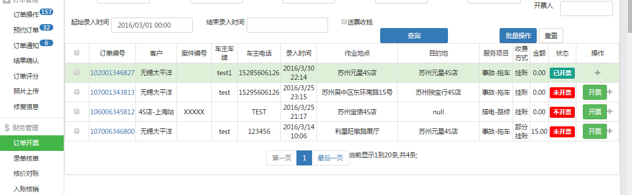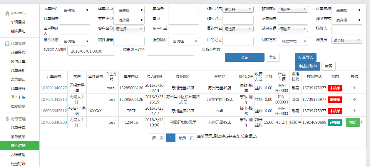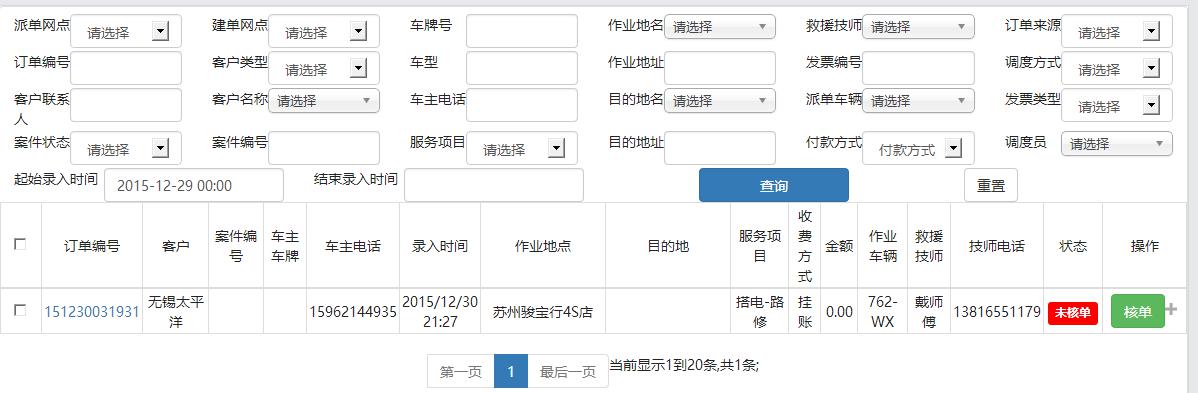 1)通过筛选订单条件(网点,订单编号等)条件来查询指定的未核单的订单通过点击订单编号可以查看到该订单的详细信息,包括客户名称,委托人,联系电话,服务项目等 2)通过点击操作可以对未核单的订单进行核单,或查看订单详细信息(核对订单信息:包括车辆信息和救援信息、核对订单价格、编辑实际入账的价格和入账方式) |