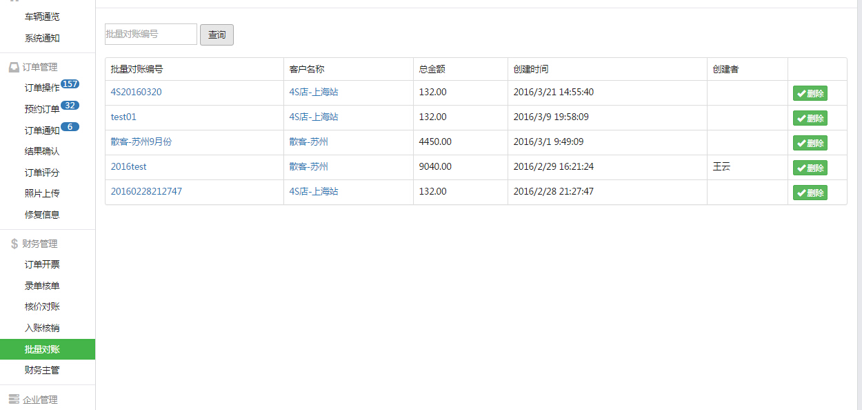 | 点击【财务管理】模块下【录单核单】菜单可以看到所有未核单的订单 |