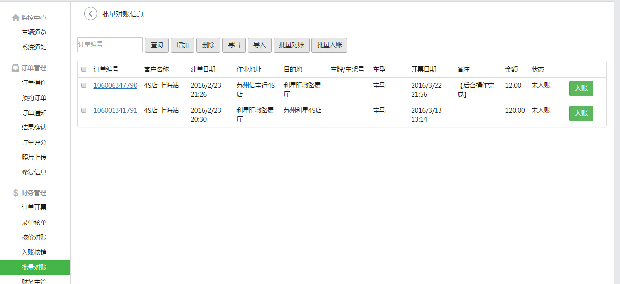| 点击【财务管理】模块下的【入账核销】菜单可以查看所有已入账或未入账的订单(详细参考核单操作) |