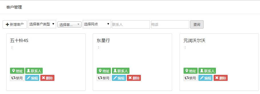 | 点击【企业管理】模块下的【客户管理】菜单可新建、查询、禁用、编辑和删除客户,例如:物流公司,4S店等 |