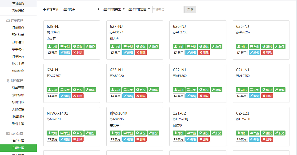 | 点击【企业管理】模块下的【车辆管理】菜单可新增、查询、编辑、禁用、删除即分配相关信息。 |