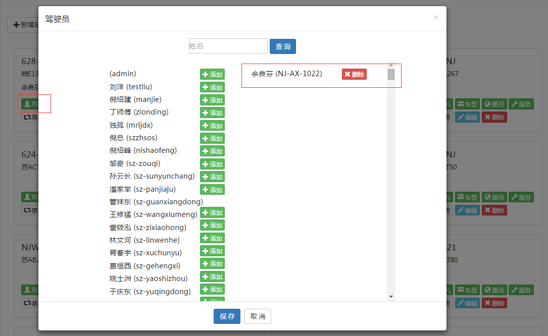 | 点击【司机】按钮给该车辆添加一个或多个司机,也可删除司机。 |