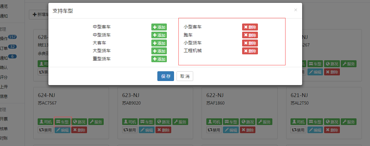 | 点击【车型】添加或者删除车辆所支持车型(该数据是系统的基础数据) |
