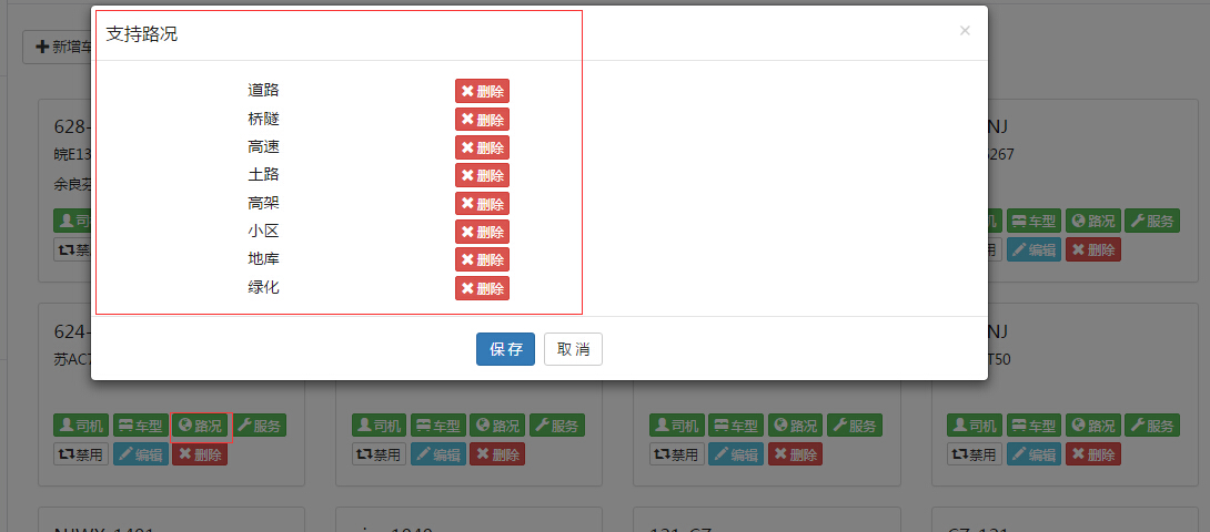 | 点击【路况】设置车辆的支持路况(该数据是系统的基础数据) |