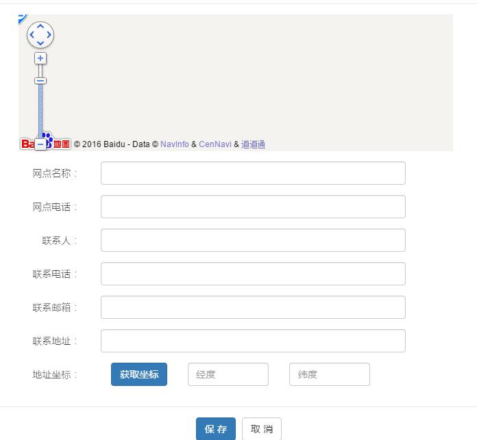 | 点击页面【+网点管理】新建网点信息,内容包括网点名称、电话、联系人、地址、坐标等信息。 |