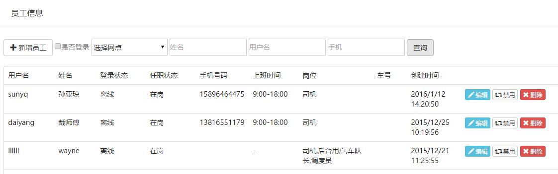 | 点击【员工管理】模块下的【员工信息】菜单可新增、查看、编辑、禁用和删除员工 |