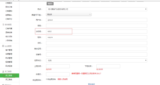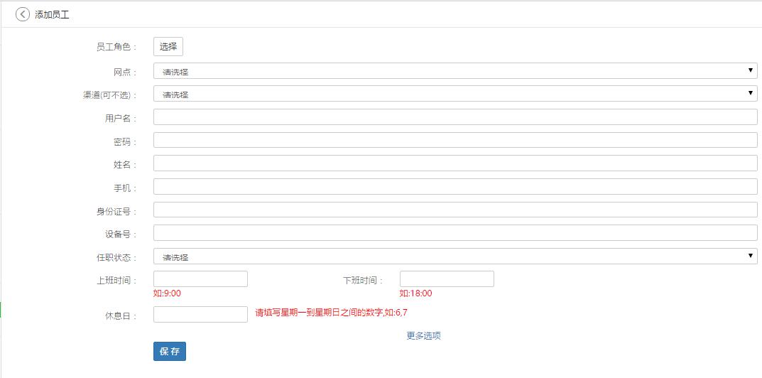 | 点击【+新增员工】添加新的员工信息,内容包含员工职位,员工所在网点,注册新的员工用户名及其密码,个人信息,任职状态和上下班时间。 |