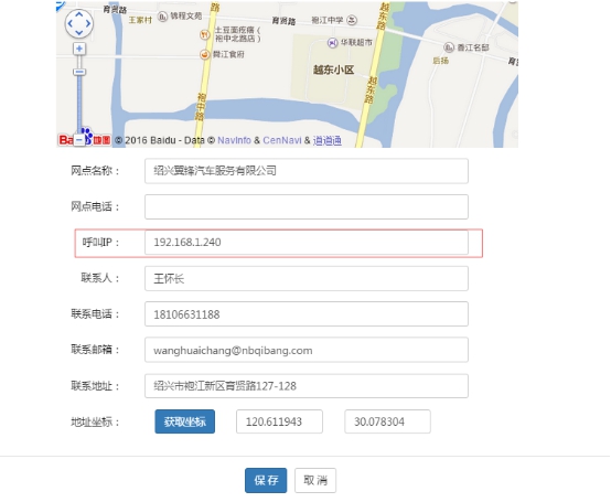 | 1.给当前网点分配IP,登录系统”网点管理”->选择当前网点进行编辑,将呼叫系统的访问IP填入保存即可,如图: |